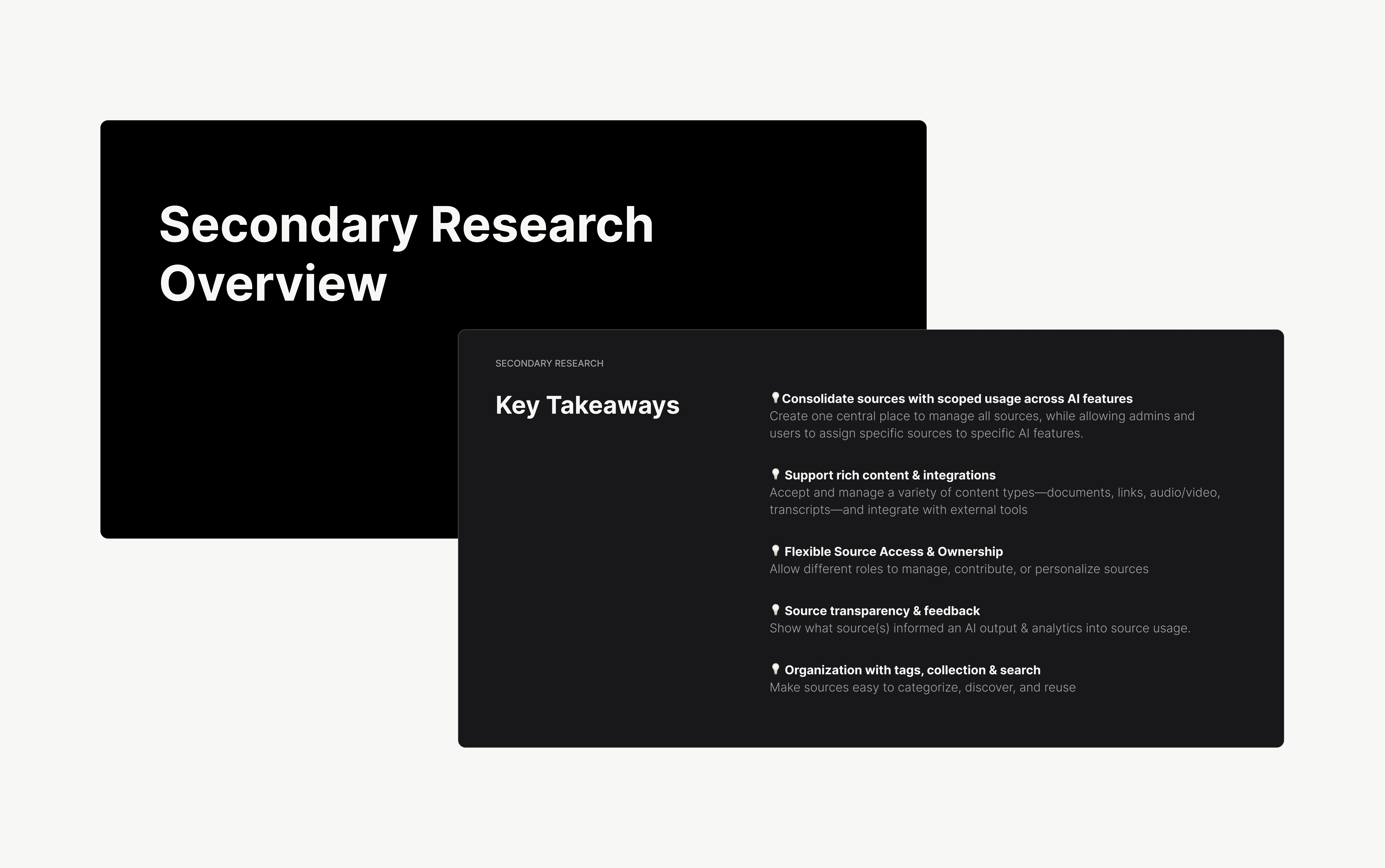From there, secondary research looked at how other AI-powered products (both direct competitors and adjacent tools like Notion AI, Glean, and knowledge management platforms) handle source transparency and AI orchestration settings. Most shared a common pattern: centralized, well-organized knowledge management with transparent sourcing, flexible role-based control, and support for a wide range of content types and integrations.