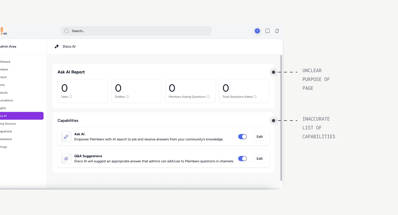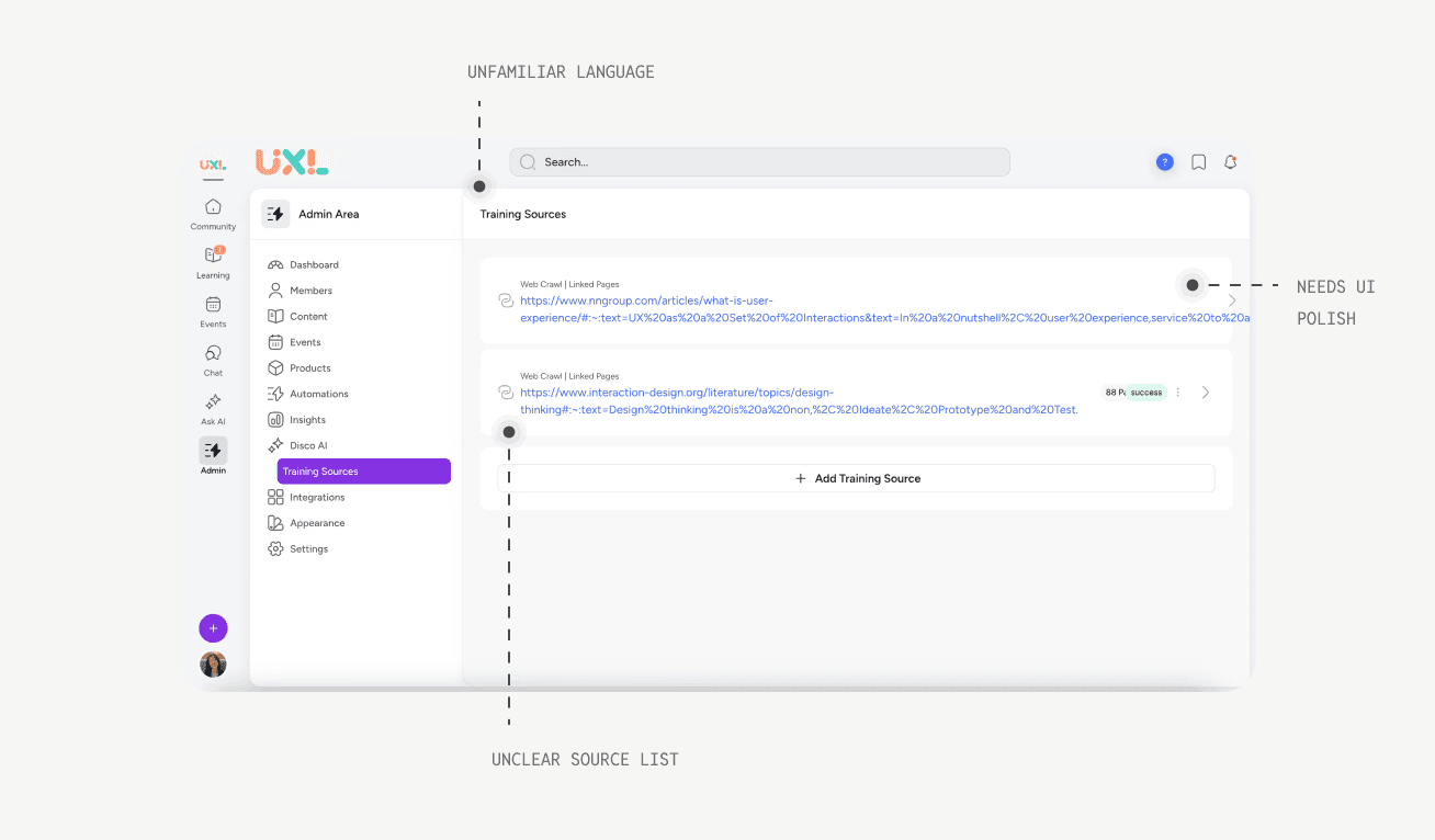 Disco's AI feature set had outgrown its data foundation. As new AI tools launched like Ask AI, curriculum generation, and Q&A bots, each pulled from separate, inconsistent sources with no shared control or visibility. Users didn't know what the AI knew, couldn't adjust it, and couldn't trust it.