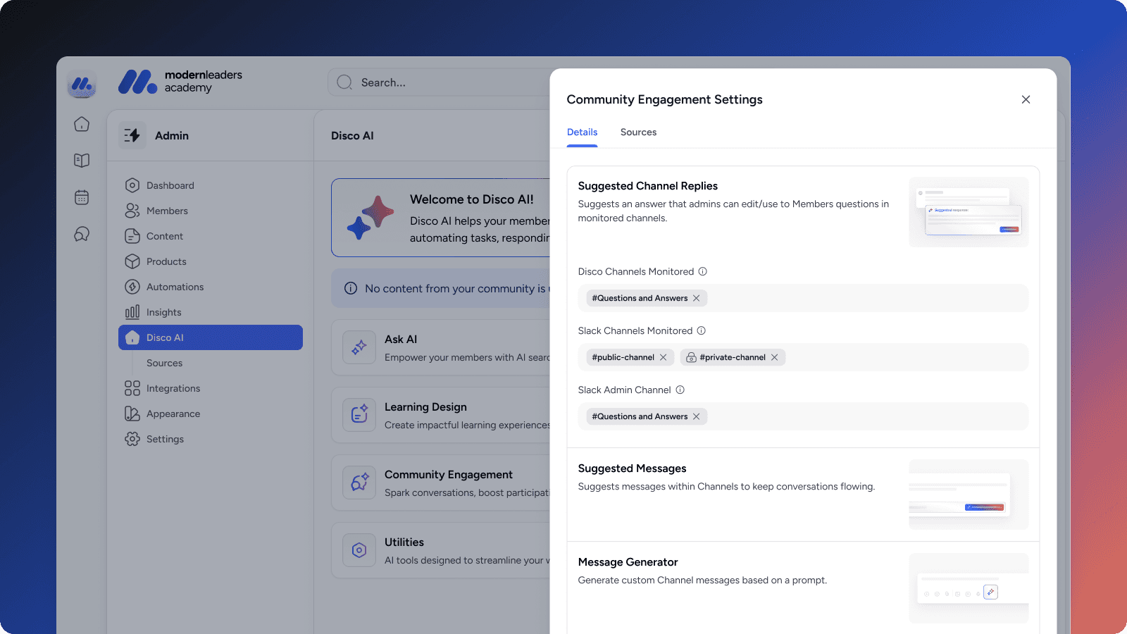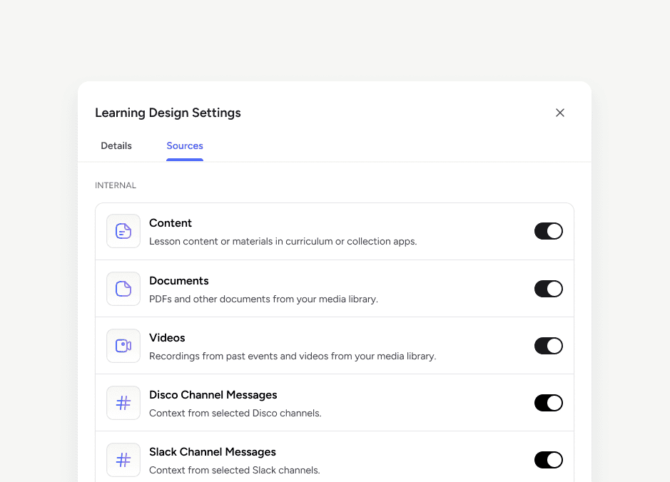 Every source powering Disco's AI is now visible in one place. Internal sources are surfaced automatically so nothing is hidden, and external sources can be added and managed here when want to bring in public content from outside the platform.