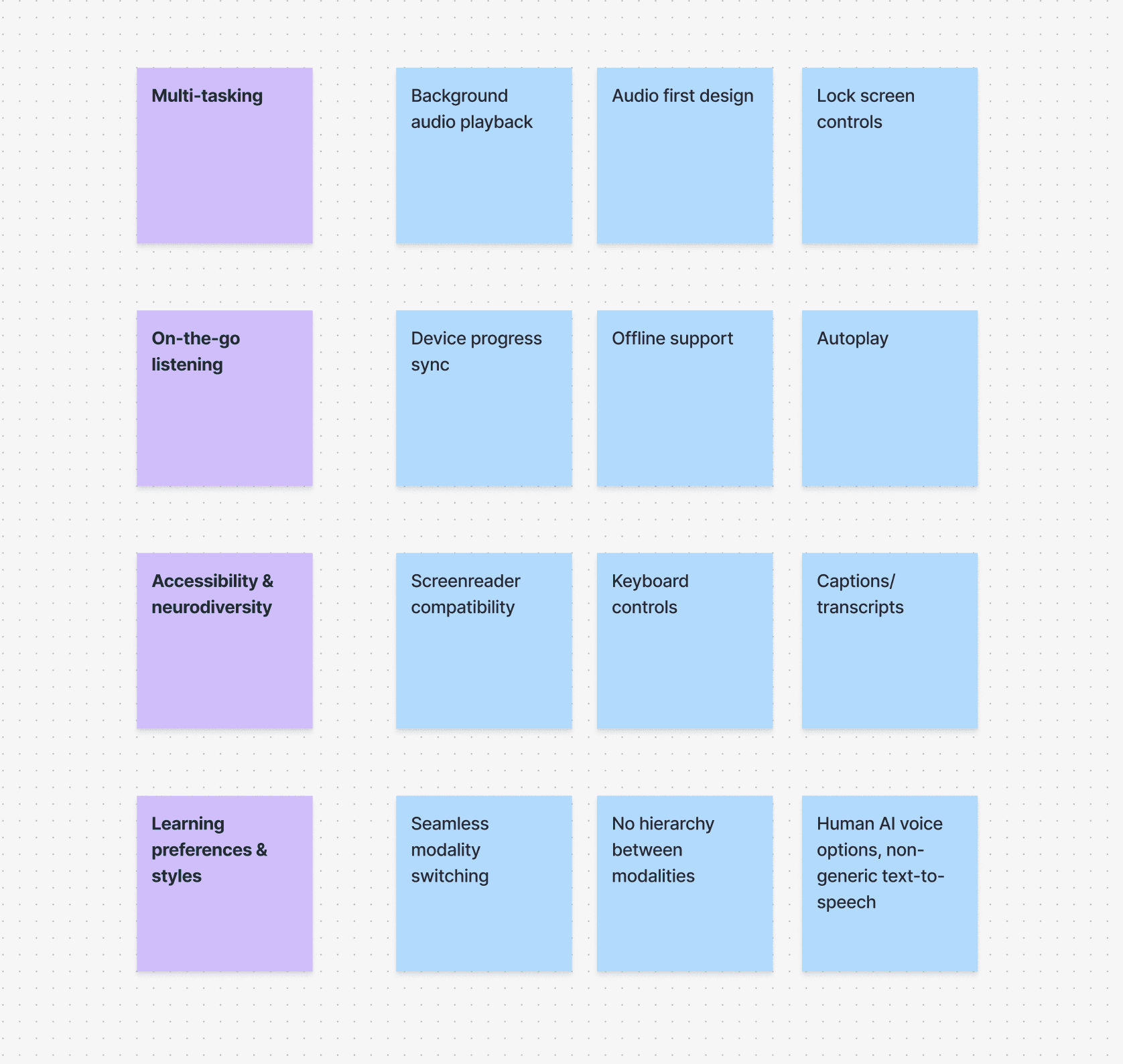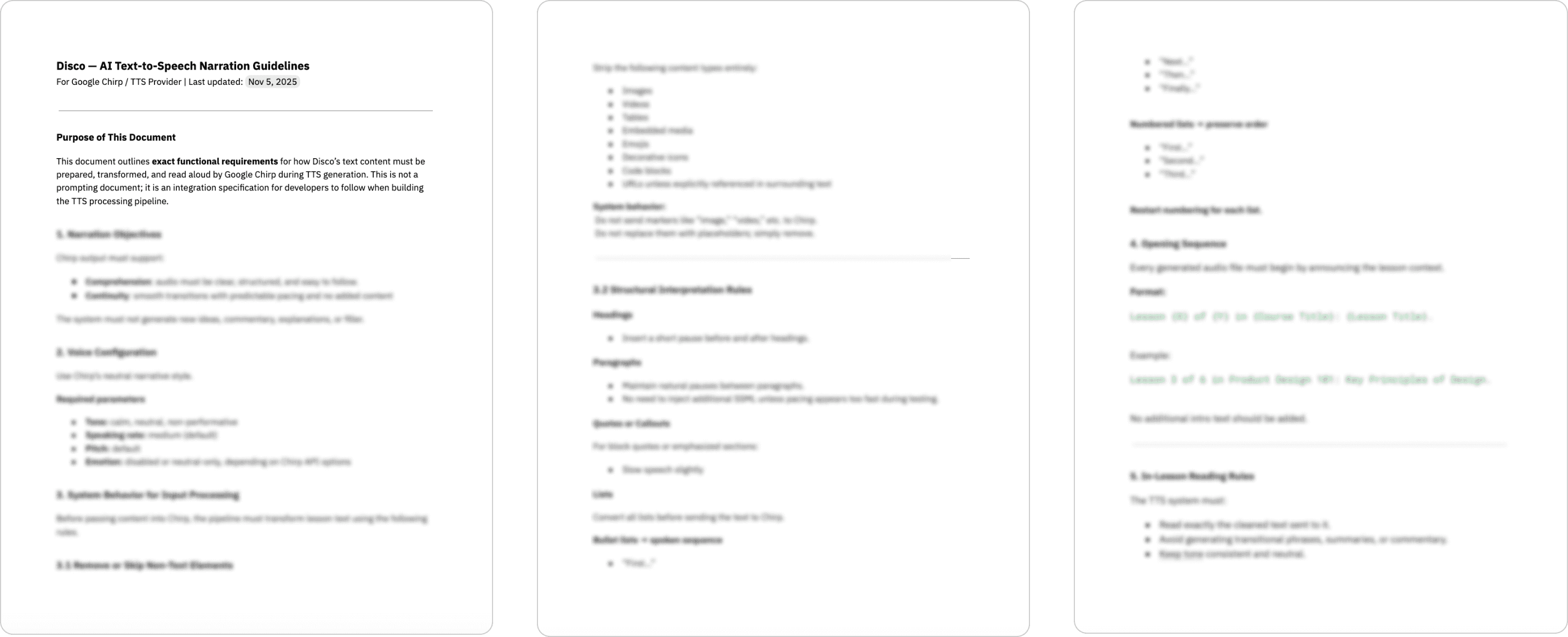 The last part of the design process was thinking through what the audio should sound like, including how text should be transformed into something clear, structured, and easy to follow via the tone, pacing, voice, end of lesson closing behaviour, and more.