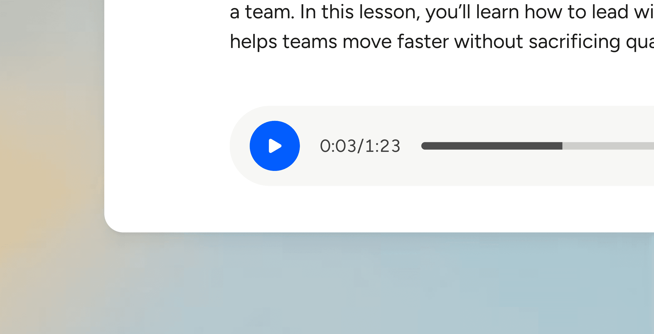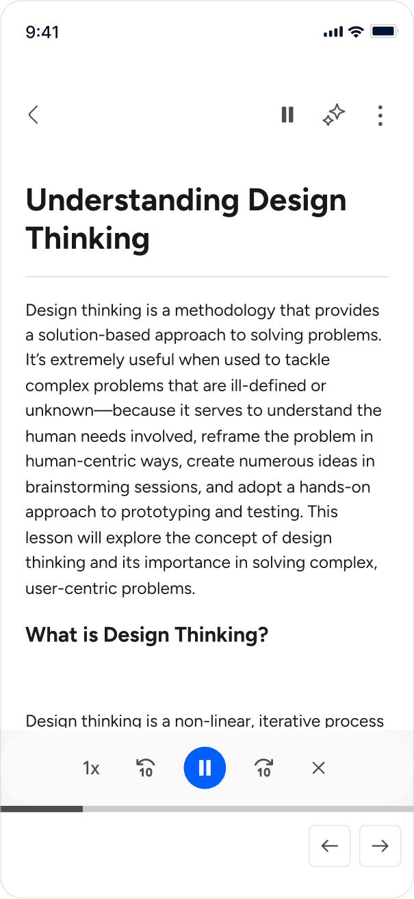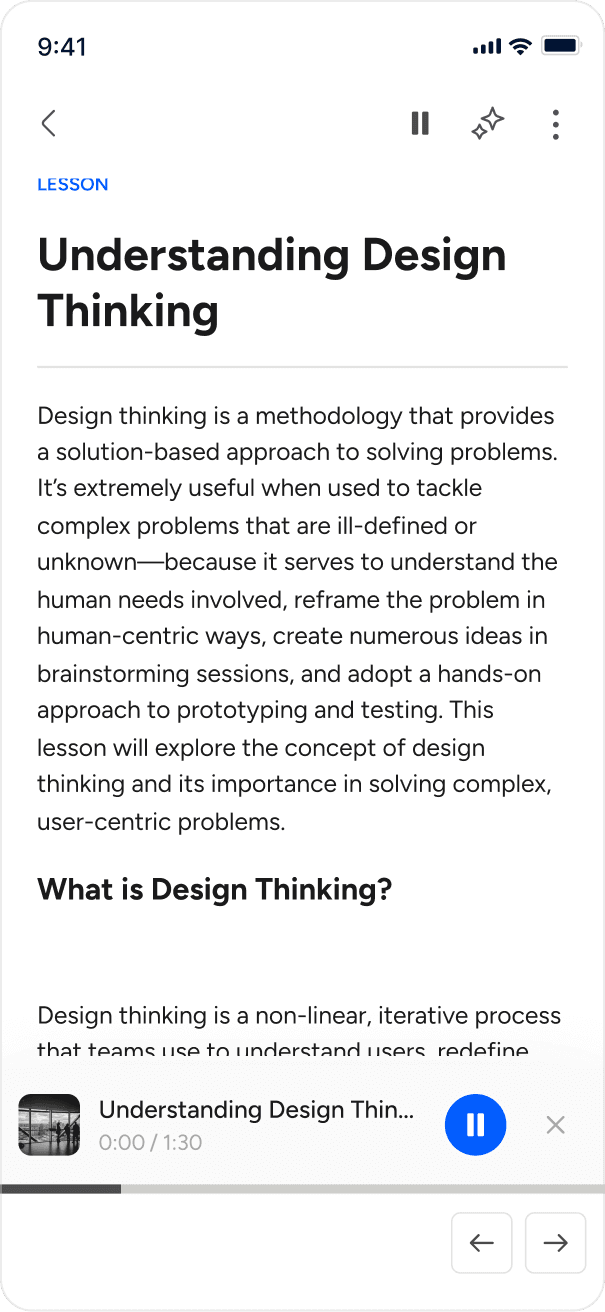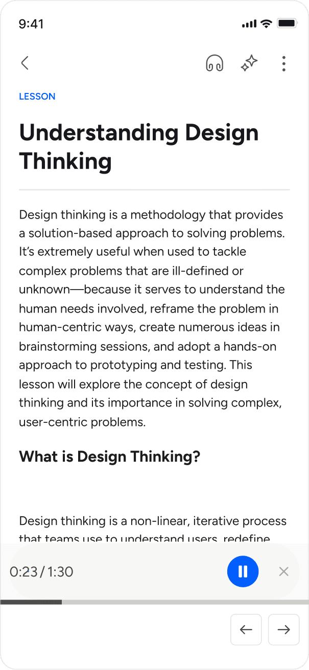 Led design that embedded high-quality AI narration on text-based lessons to enable more flexible, accessible & effective learning.