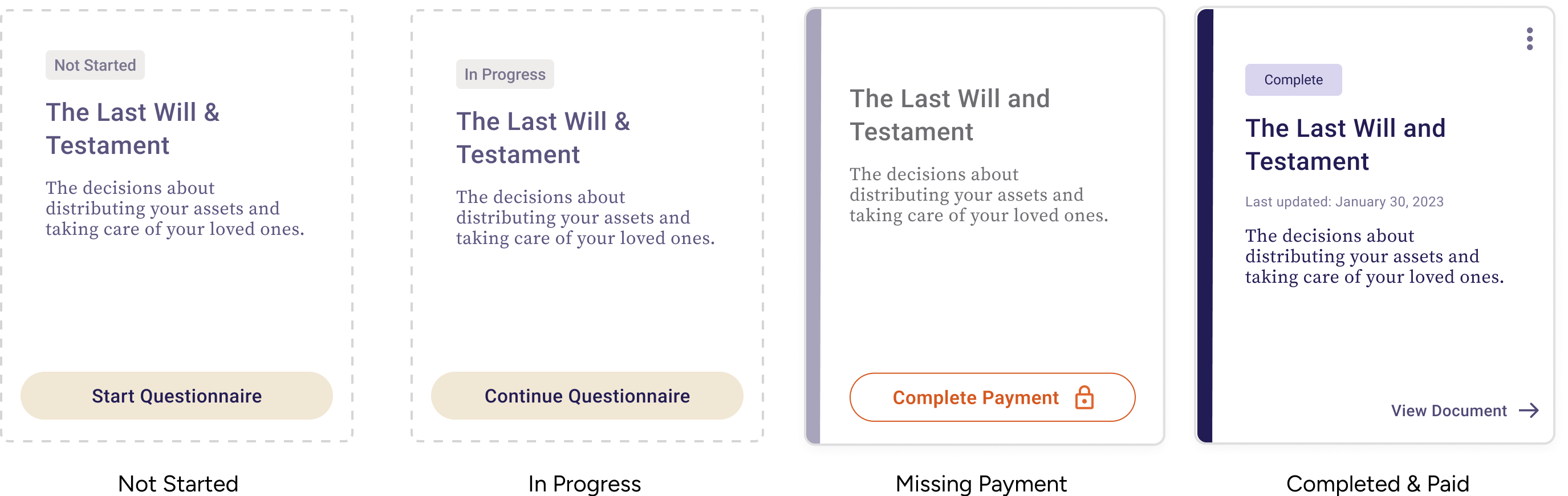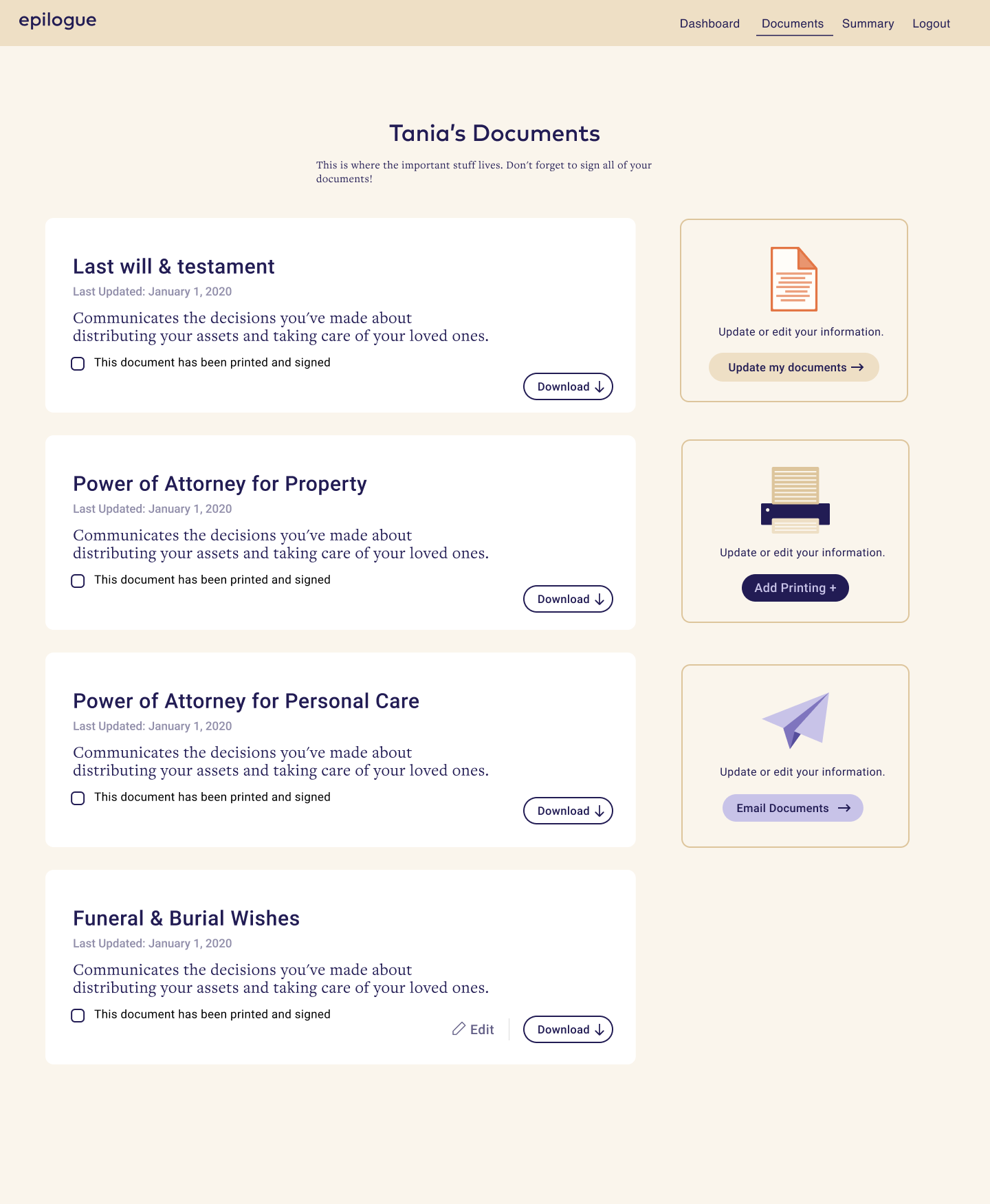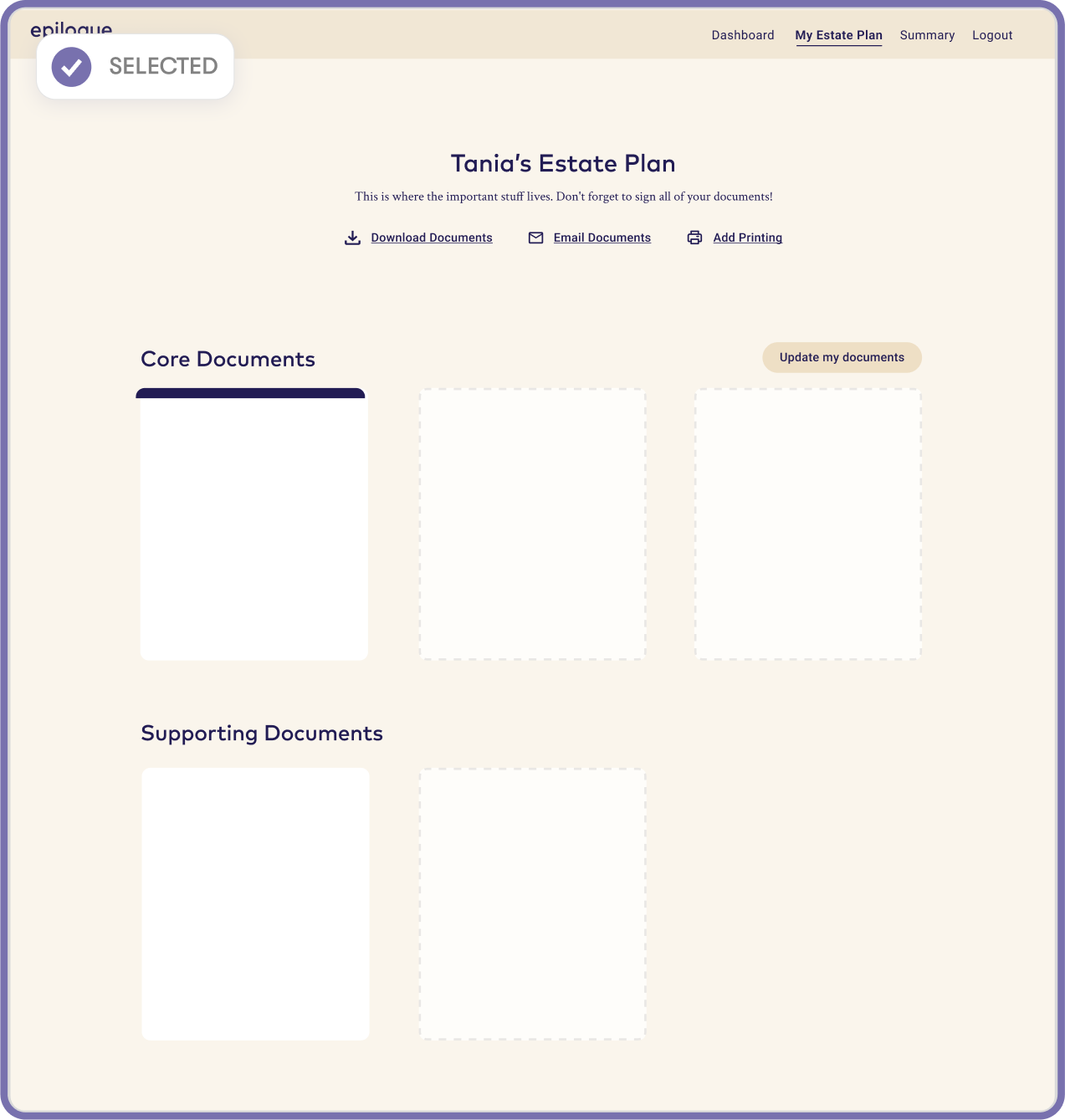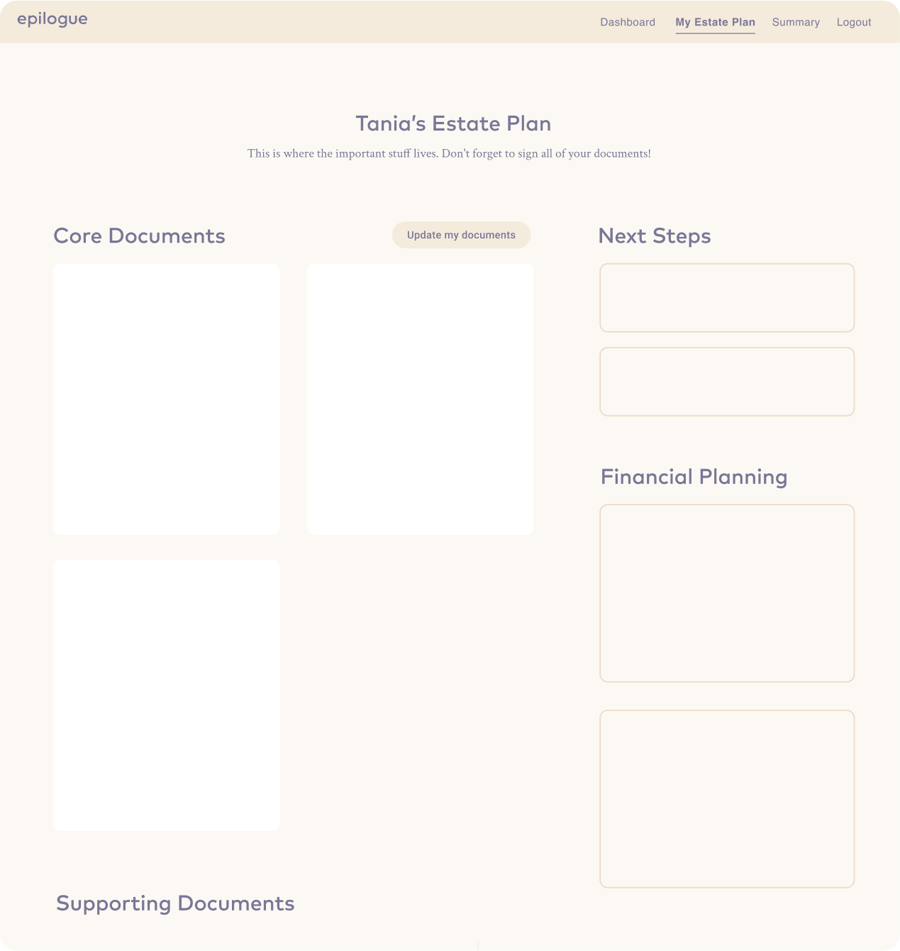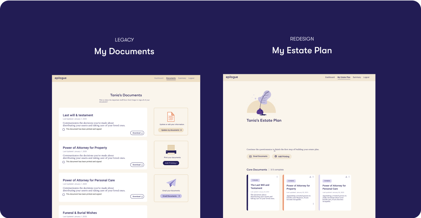 Epilogue is a platform that helps people create a will online. As the sole designer, I tasked redesigned the Documents page so that users could navigate the estate-planning process with clarity and confidence, while also improving key business metrics.