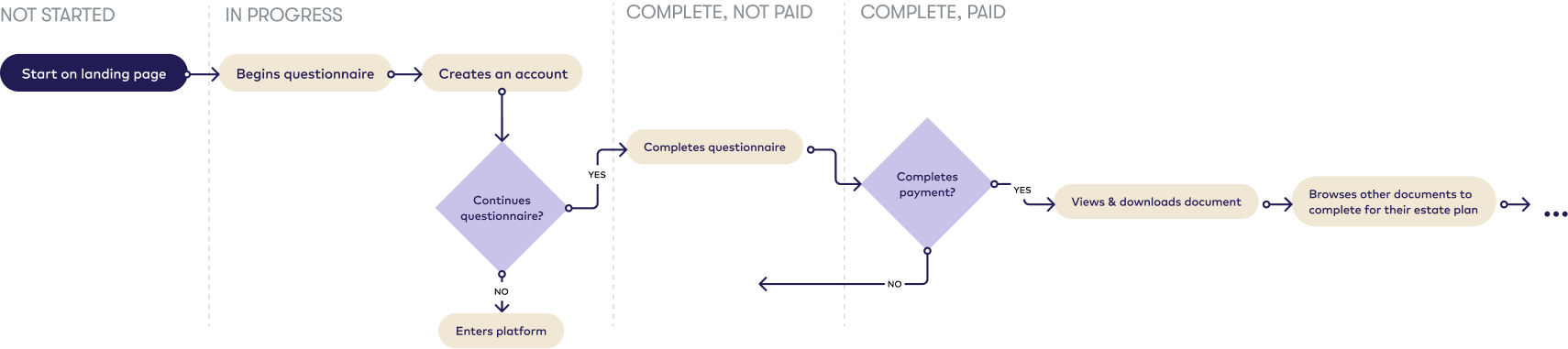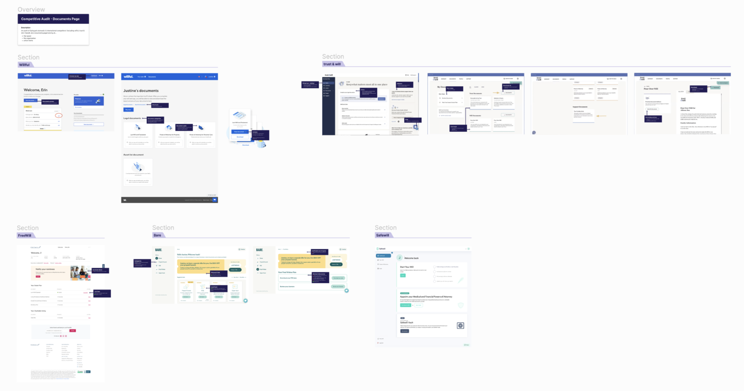 I audited the high-level experience from starting on the landing page to getting full access to their will. From this, I created a user flow to depict stages in the document creation process.